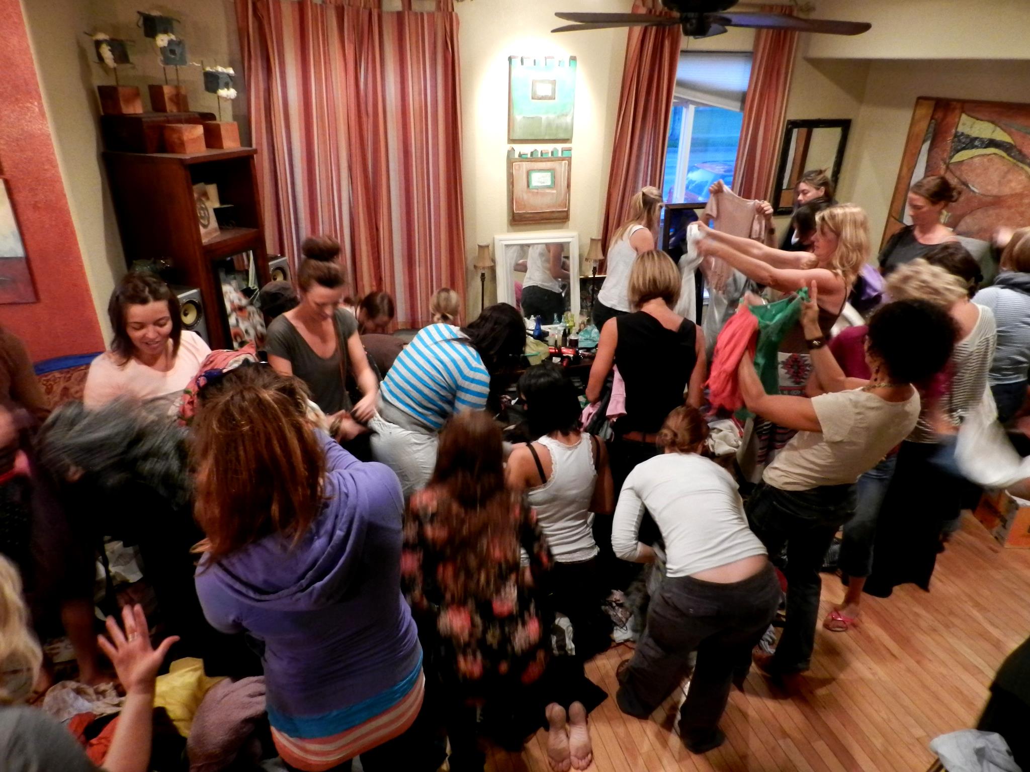 Clothes flew across the room as we found things we thought would be great on our friends. It didn’t stop at the friends we came with, and we sized up our neighbors, though not in the bad way. The flatter-chested traded with the bigger-boobed. The taller gals passed the shorter pants and skirts to the more petite. The first round of try-ons went back into the pile, which at times seemed bottomless. Every once in a while we turned the thing like a giant compost pile, and eventually the pile evolved into more of a slug shape so more women could have access to it. We were cooperative and conscientious.