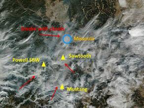 The closest fire to Missoula is about fifty miles south in Hamilton where almost five thousand acres are burning and the blaze is 25% contained. We’re getting our share of that smoke, as well as smoke from all other directions. By far the most smoke is coming from Idaho, where the Mustang Complex fire is currently at 327,017 acres with 20% of it contained.