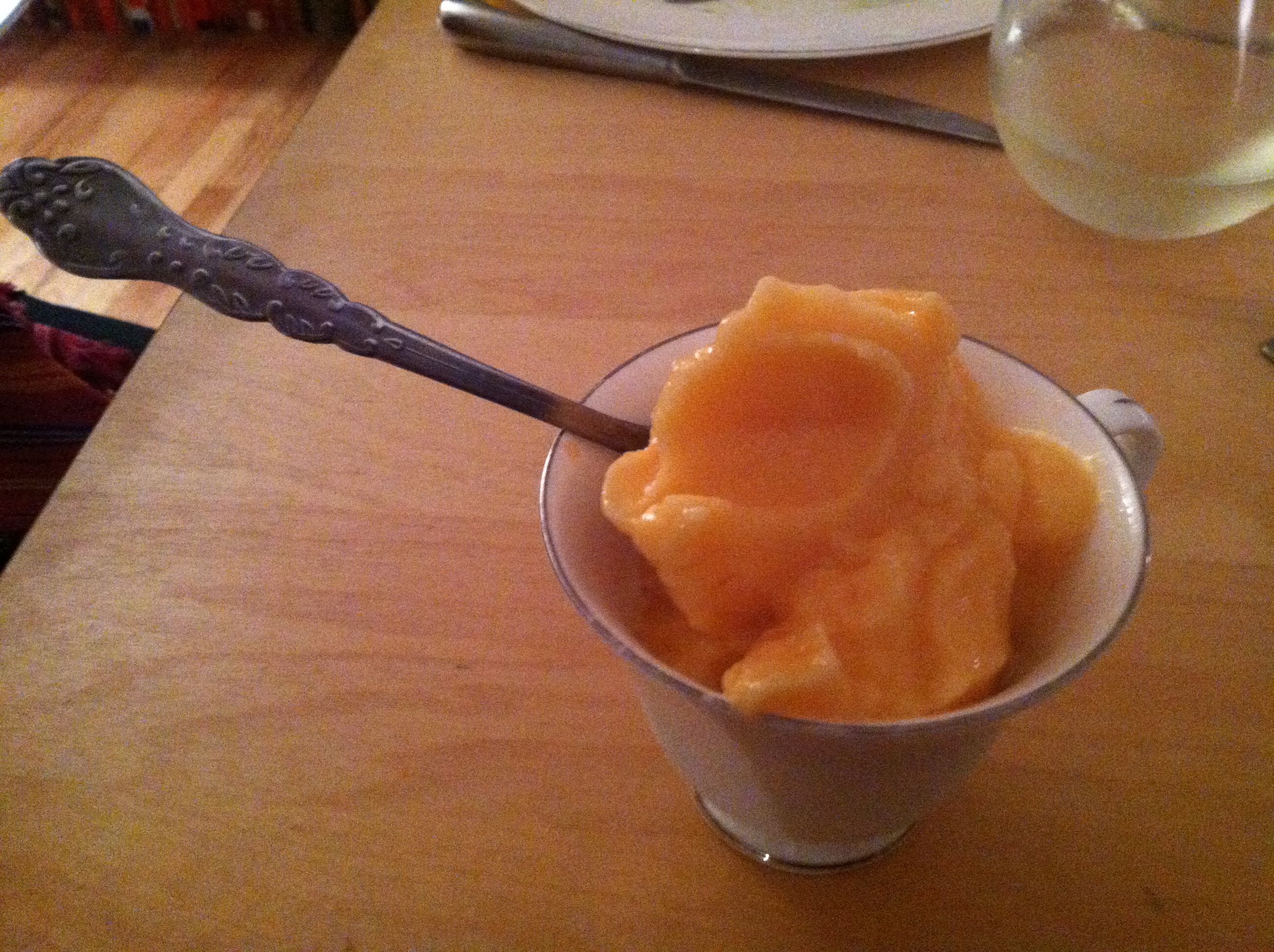 I spent a lot of the day preparing the meal. I went to one farm stand and two grocery stores for my ingredients. I squeezed lemons and vitamixed dressing then blanched picked-that-morning ears of corn and sliced off the kernels for the salad. I peeled, chopped and roasted. I sliced, layered, and measured with my eyeballs. I gutted local melons and froze chunks so we could have a palate cleansing sorbet course. I figured if you’re going to be in a makeshift dining room you might as well be classy about it.