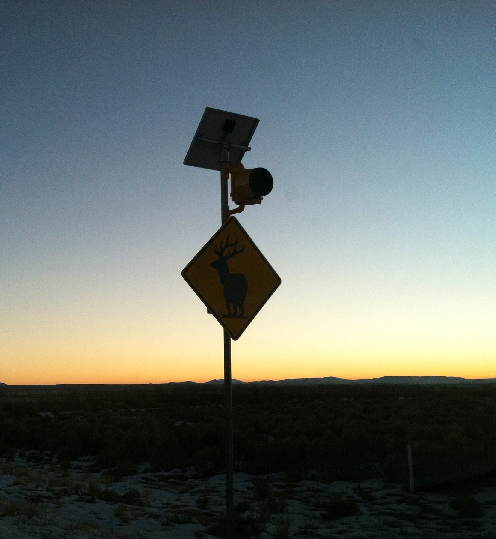 - An elk crossing warning sign at sunset. WHY am I once again driving these roads at dark? (stayed too long at the hot springs) WHEN will I learn? (hopefully very soon. I drove so slowly. Does that count?)