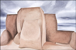 The church is made of adobe—which Ranchos de Taos residents re-mud every year—and it’s said that for O’Keefe it was more like painting a landscape than a building since it’s made of the earth. She described it as “One of the most beautiful buildings left in the United States by the early Spaniards,” and that it’s as compulsory for New Mexican artists to paint as a self-portrait. Here’s one of her paintings that showcases the unique beehive buttresses of the backside of the church. She painted three images of the back and only one of the front.