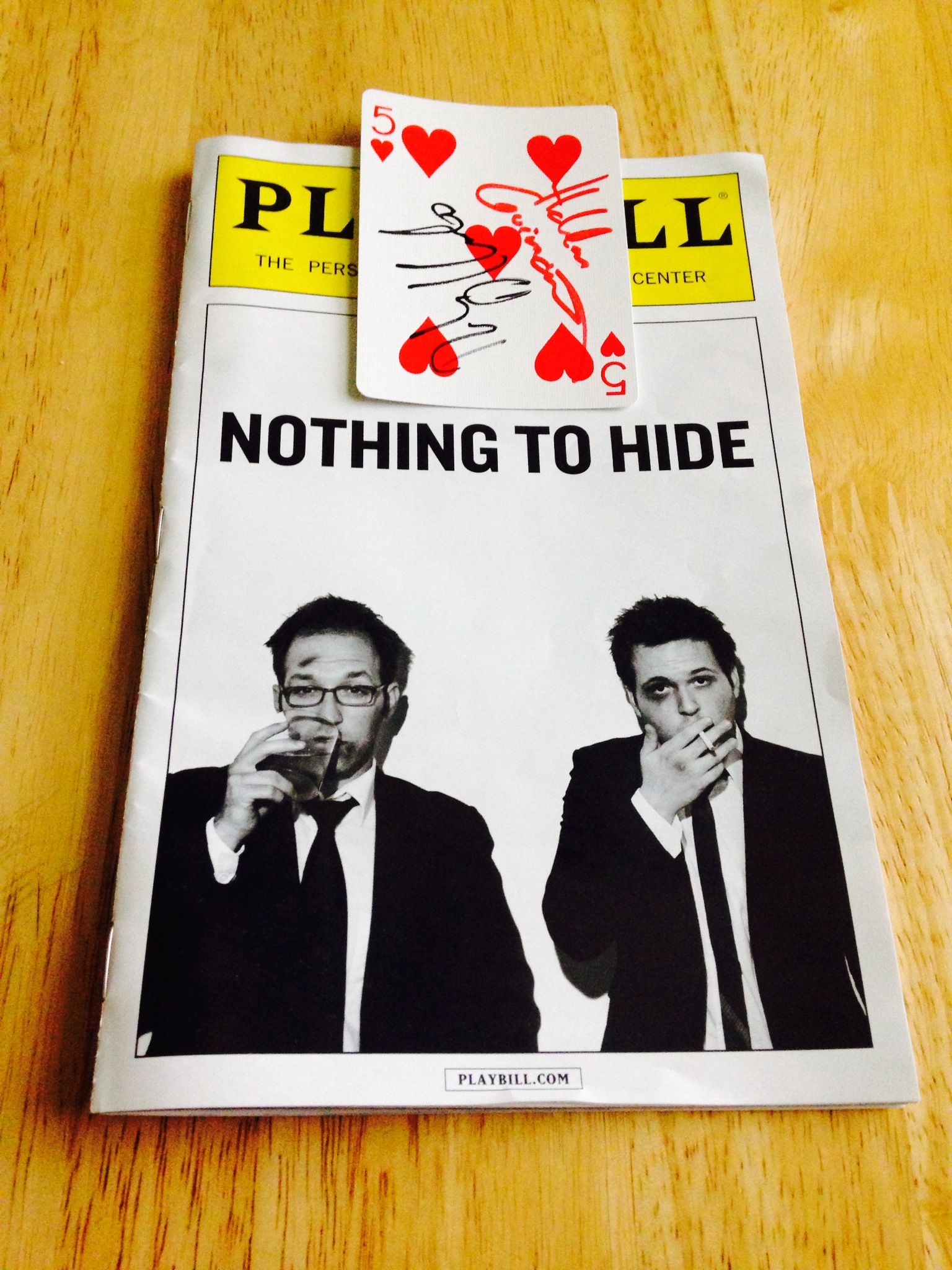 The New York Times review starts with the author looking at the card he got during the show and kept as a memento—in his case, the five of hearts. As I reread the review this morning I had to run to my purse and pull out my playbill to confirm the name of the card stuck inside: the five of hearts.