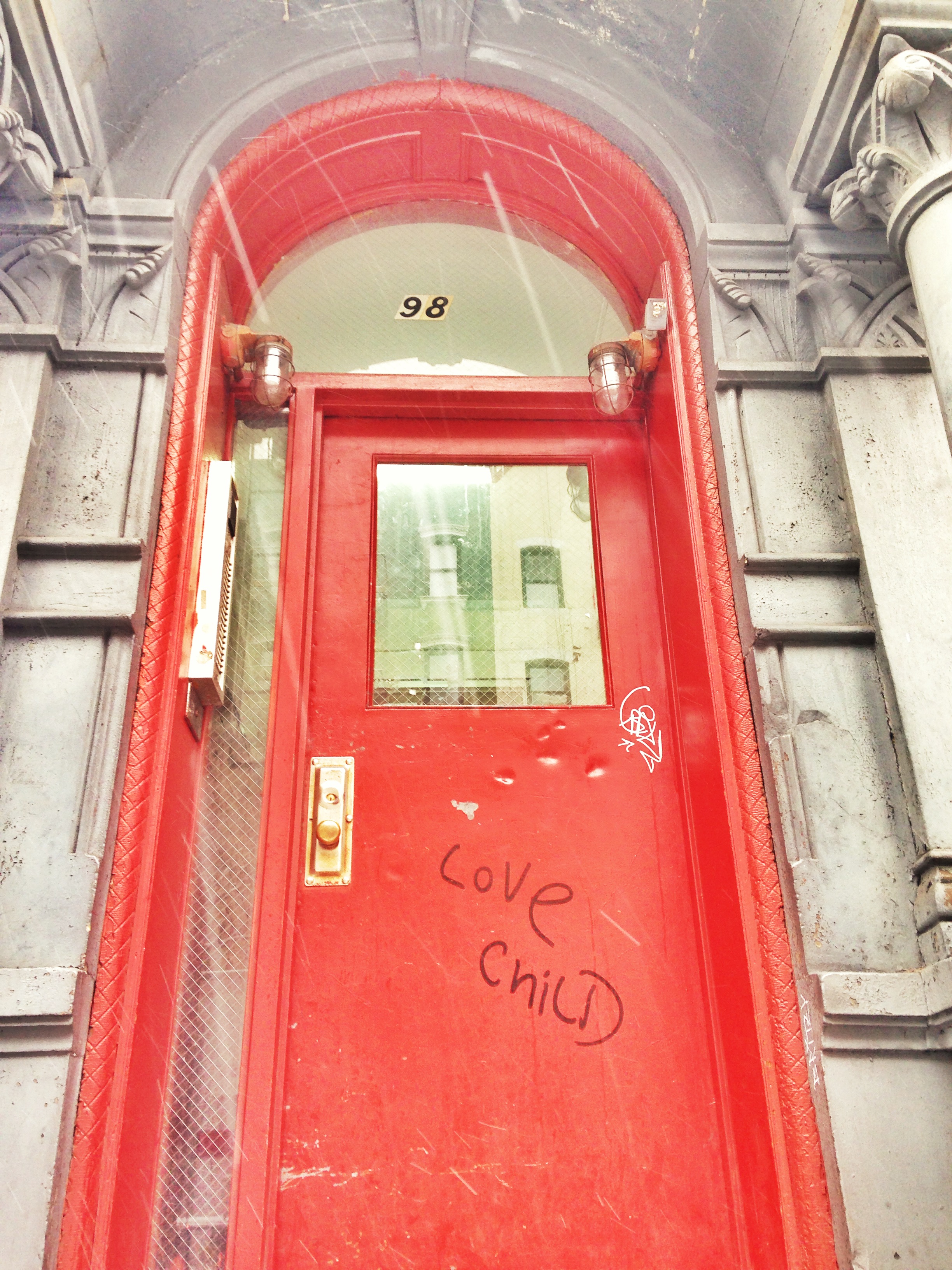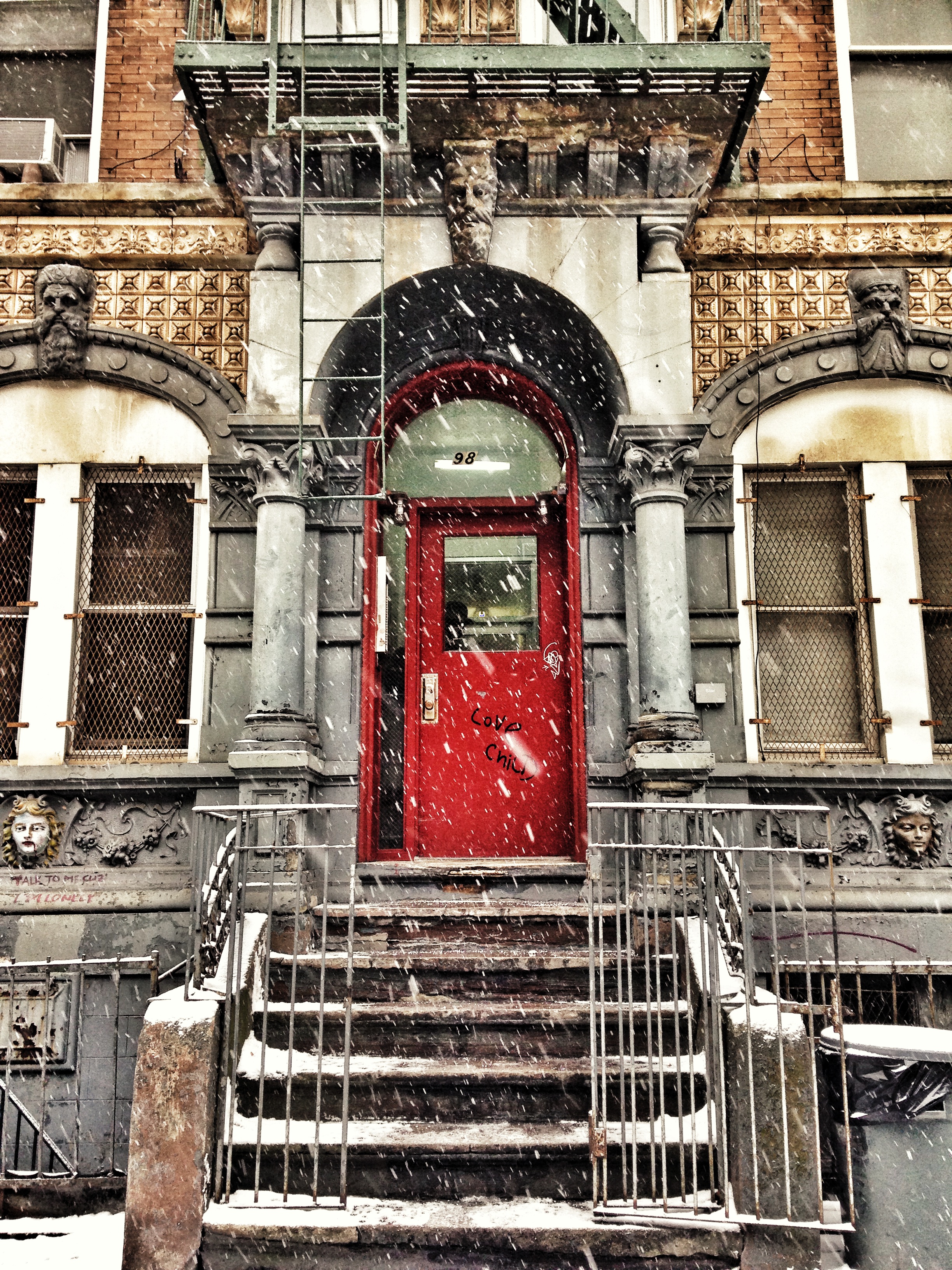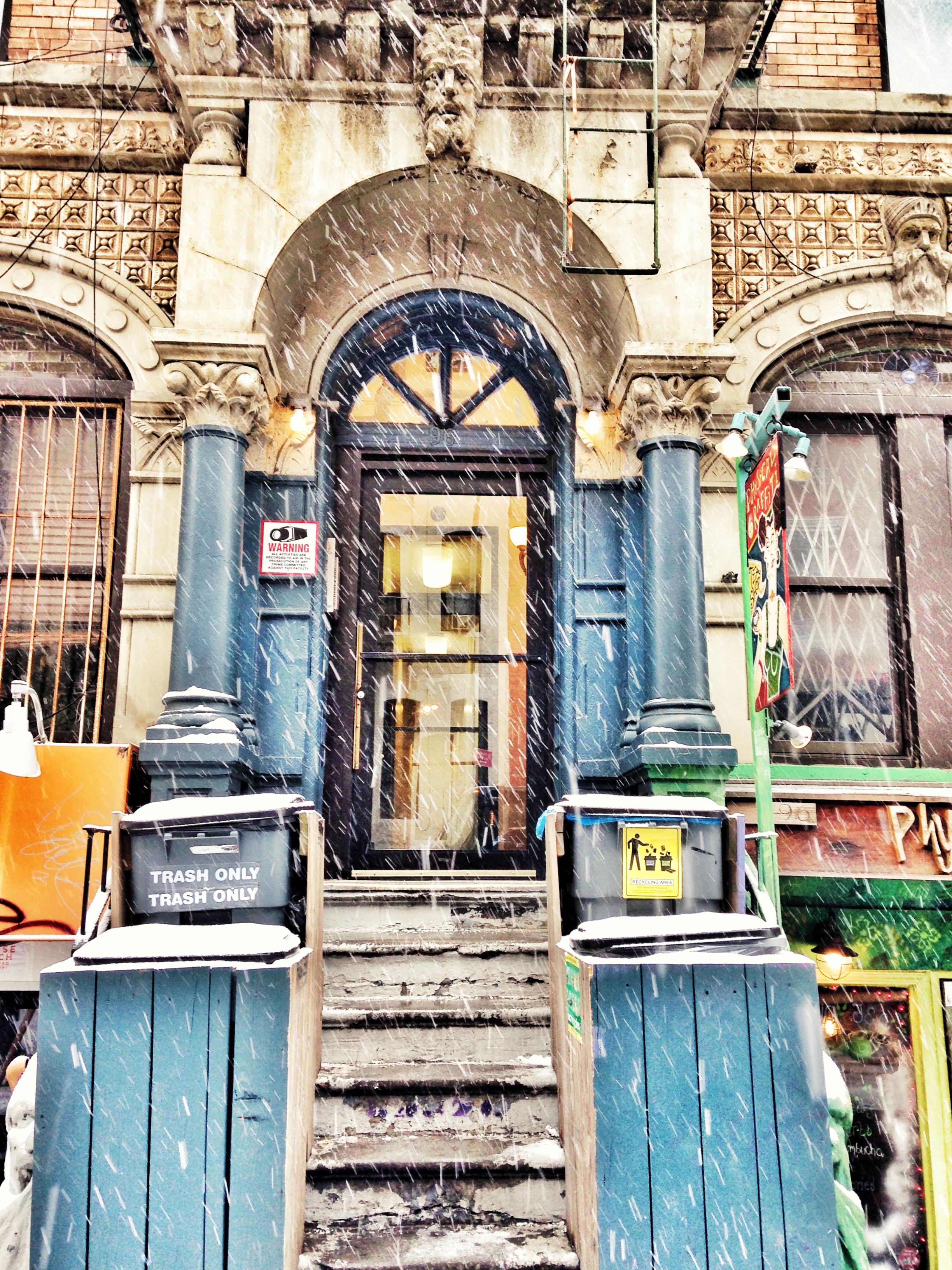 Knowing I’m in New York right now taking care of my grandmother, John asked me to take a picture of 96-98 St. Mark’s Place, and of course I said yes. It was snowing yesterday, and though it was beautiful coming down the streets were a slushy mess. I’m currently working on a deadline for this book, and a just-for-fun fieldtrip on a messy day shouldn’t have been on my activities list, but I had faith that a walk to St. Mark’s place would land me in the perfect spot to write.