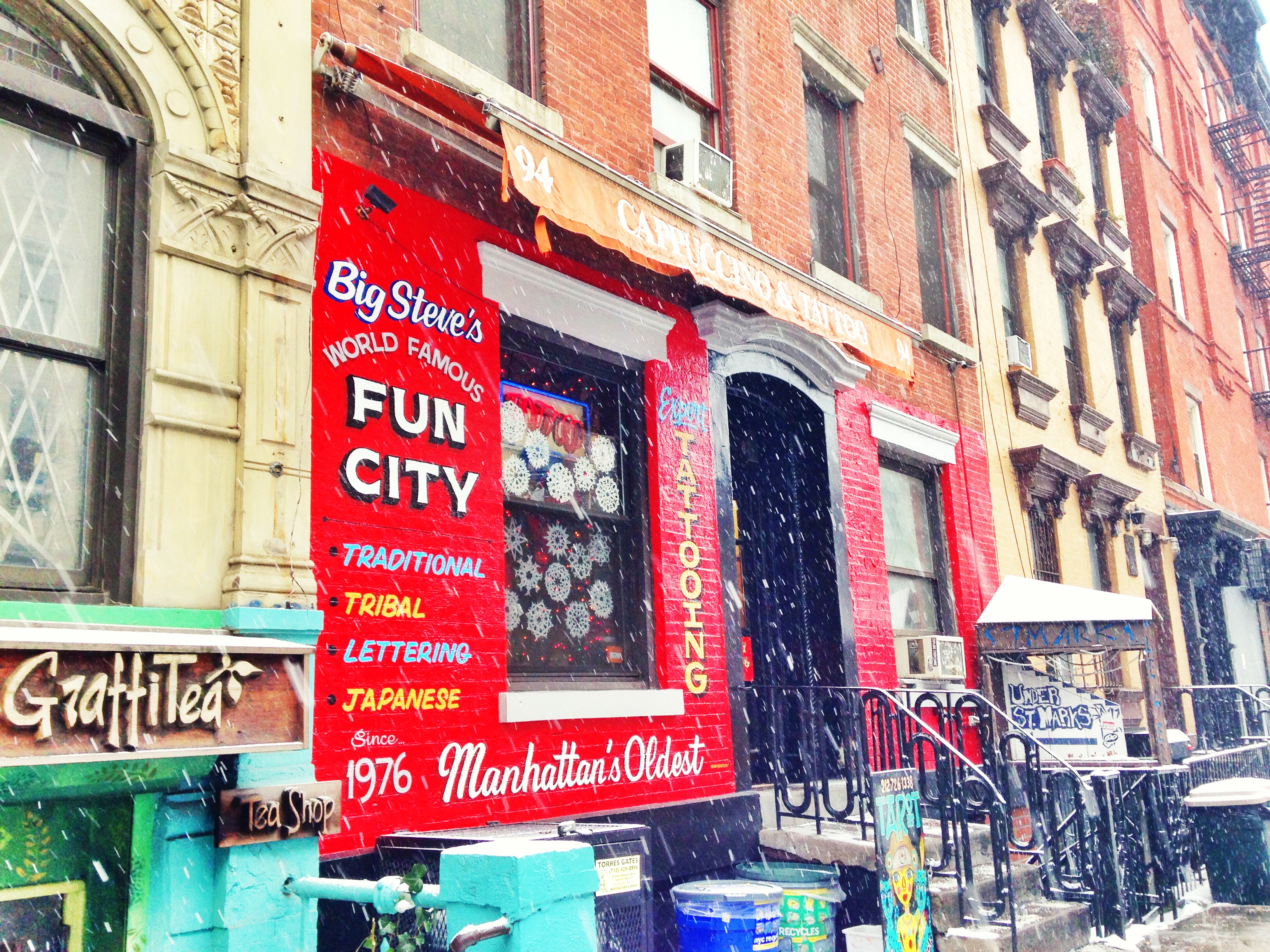 When John gave me the address I didn’t realize it was one of my favorite blocks in the city: St. Mark’s between 1st Avenue and Avenue A. It’s across the street from East Village Books—a dusty old shop you step down to enter—and a few houses down from Manhattan’s oldest tattoo shop that advertises both cappuccinos and tattoos, and yes I’ve wanted to go in there for some of each. Yesterday I finally went in, but didn’t get anything—not yet anyway—though when I pull the trigger I think that will be the spot.