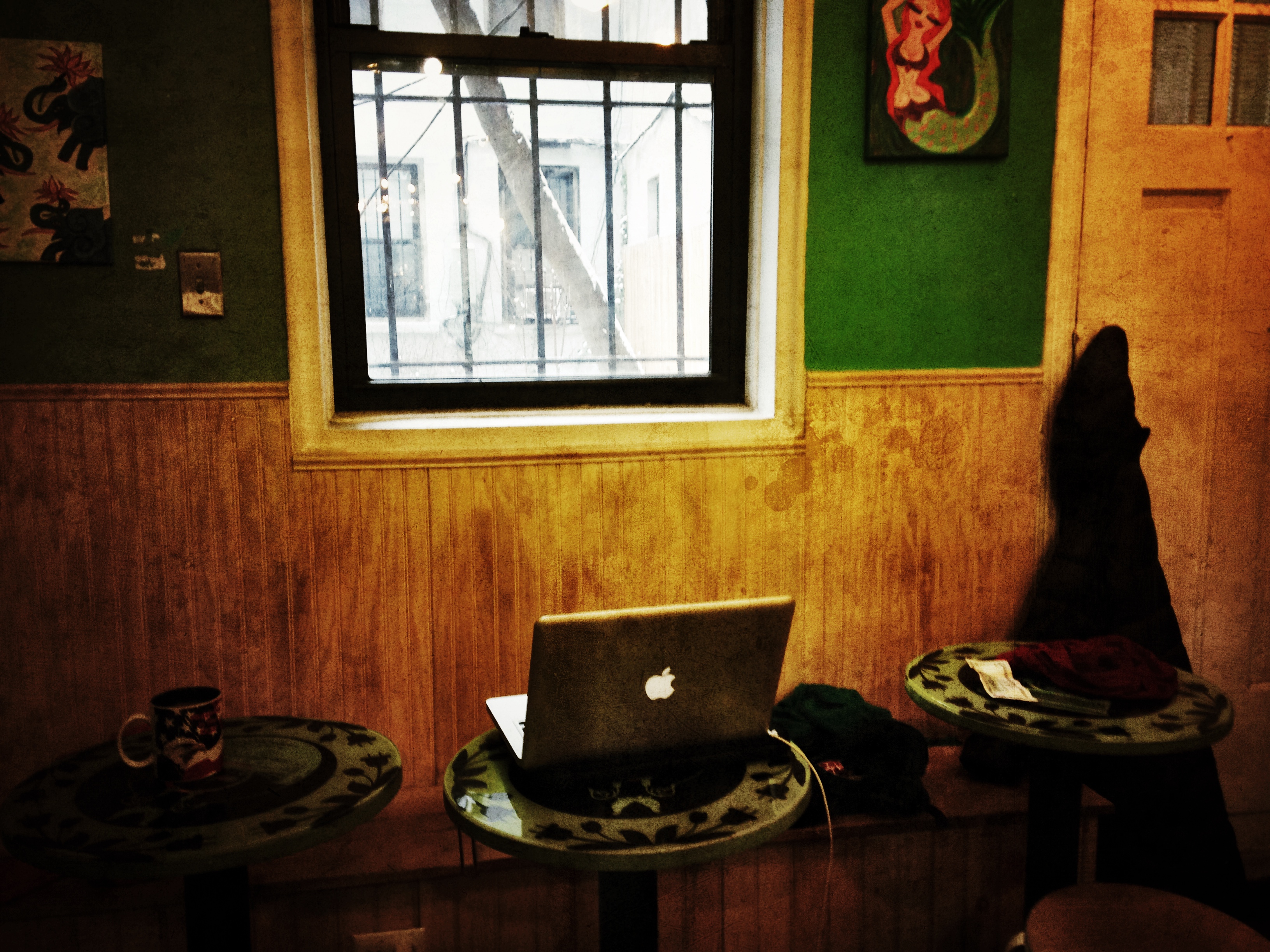 I spent the better part of yesterday writing in a coffee shop on Avenue A in the East Village. In the front it’s an eco-general store called Sustainable NYC, and in the back it’s a coffee shop. The coffee area has a terrific seating area that feels more small-town than big-city, and the barista reminded me of an old friend.
